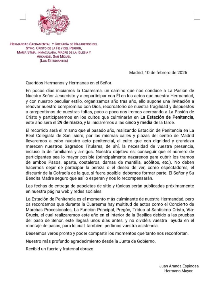 El pregón tendrá lugar el domingo 8 de marzo, tras la celebración de la Función Principal de Instituto. Con la certeza de que su pregón recogerá la riqueza de nuestra tradición y el sentido espiritual que nos convoca como comunidad, confiamos en que sus palabras, fruto de una vida dedicada al servicio pastoral a las que se une un conocimiento profundo de nuestra Hermandad, serán un hondo motivo de reflexión, inspiración y celebración para todos los hermanos y fieles que acompañen este día.
